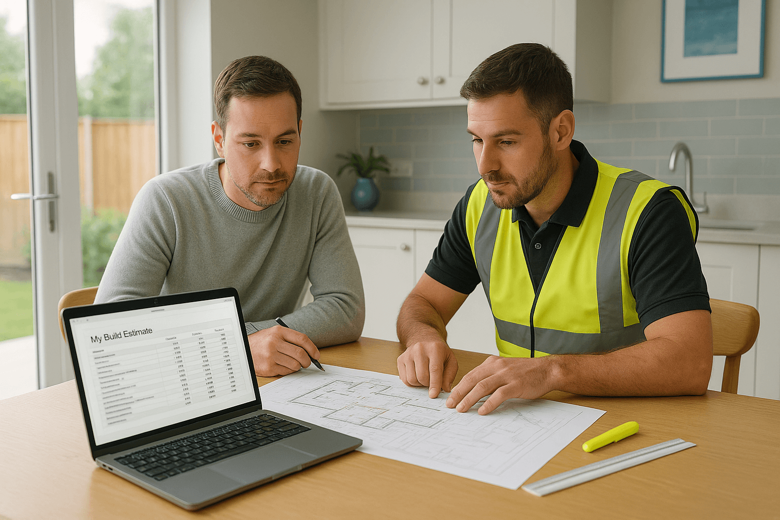 “My build estimate” should show scope tied to drawings, measured quantities with unit rates, prelims, OHP, risk/contingency, inflation and VAT—so quotes are comparable.